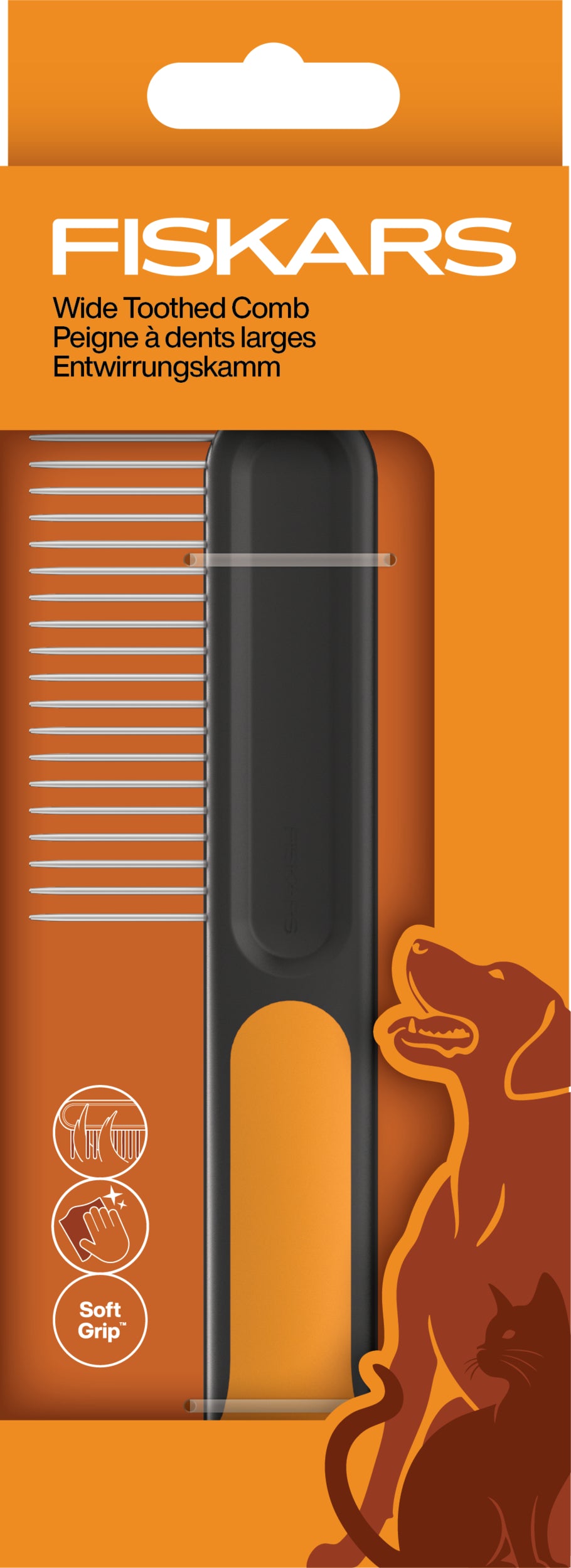 - Harvapiikkinen Fiskars-kampa hellävaraiseen kampaamiseen ja takkujen selvittelyyn